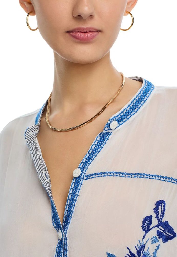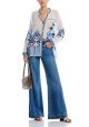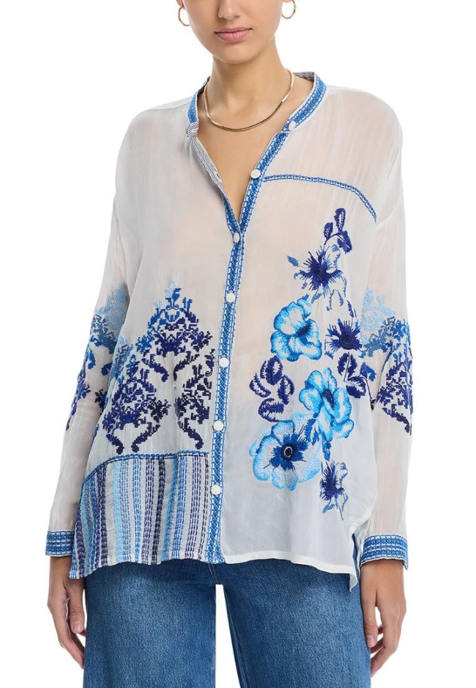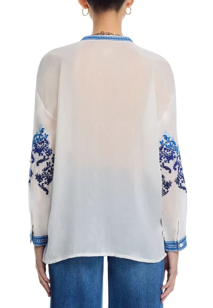 Audrey-blusen fra Johnny Was er en elegant skjorte, der kombinerer klassisk design med boheme-detaljer. Fremstillet i 100% cupro, et silkeblødt og åndbart materiale, tilbyder denne skjorte en afslappet pasform med drop-shoulder ærmer og en mandarin-krave. De farverige broderier tilføjer et kunstnerisk touch, hvilket gør skjorten ideel til både hverdagsbrug og mere formelle lejligheder.
