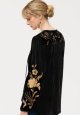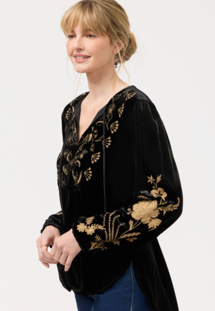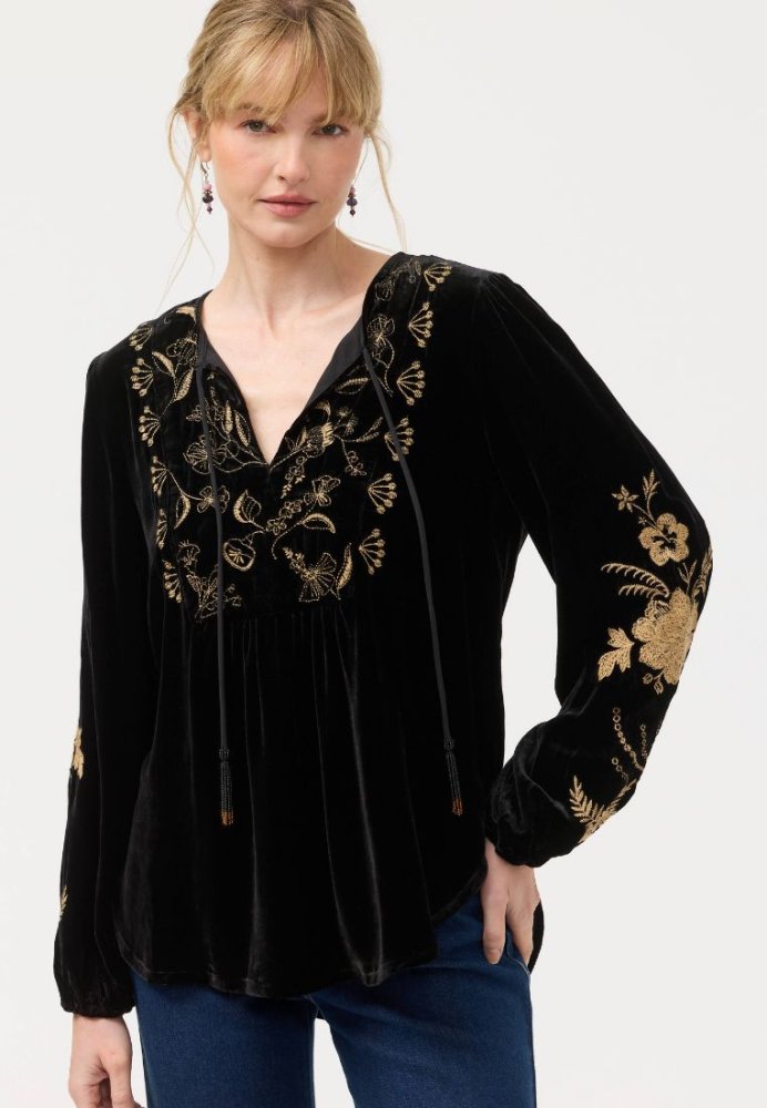 Blød bluse i silkeblanding med flot gyldent broderi, der giver lidt ekstra detalje. Den har en V-udskæring med let rynket bærestykke og lange, løstsiddende ærmer med lidt fylde. Brug den til en aften ude – for eksempel med pæne bukser og hæle for et simpelt, men stilfuldt look.